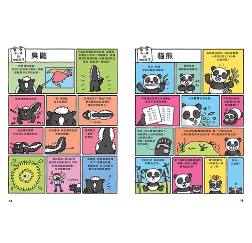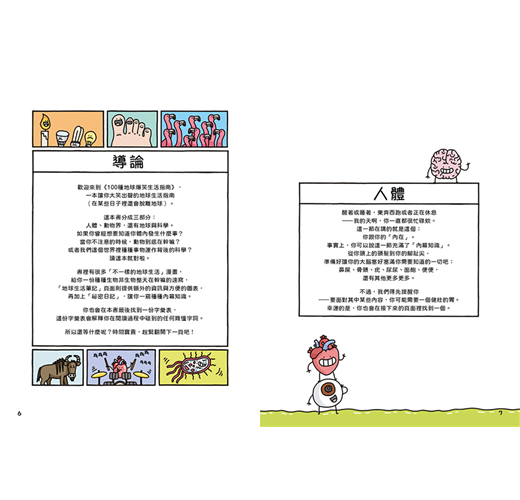 書裡有很多「不一樣的地球生活」漫畫,給你一份種種生物非生物整天在幹嘛的速寫,「地球生活筆記」頁面則提供額外的資訊與方便的圖表,還有「祕密日記」,讓你一窺種種內幕知識。
