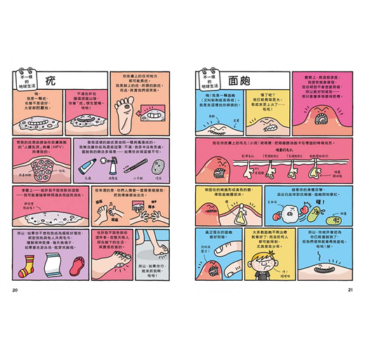 大腦 ◆ 眼睛 ◆ 張大眼睛仔細看 牙齒的祕密日記 ◆ 舌頭 ◆ 打嗝 ◆ 毛髮 毛髮上的不速之客 ◆ 鼻子的祕密日記 ◆ 疣 ◆ 面皰 ◆ 骨骼 ◆ 真有骨氣啊! ◆ 白血球的祕密日記 ◆ 肺臟 ◆ 深深吸一口氣 ◆ 心臟 ◆ 噗通跳的英雄 ◆ 胃 ◆ 肝臟 ◆ 膀胱 ◆ 尿尿與你 ◆ 腸子 ◆ 便便 ◆ 認識你的便便 ◆ 屁 ◆ 咳嗽 ◆ 手 ◆ 腳 ◆ 紅血球的祕密日記 ◆ 細胞夥伴