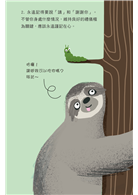無論身處在哪一個環境中,有禮貌的人總是能夠受到大家的歡迎,並輕鬆地過日子。而樹懶儘管懶惰卻有一套屬於他的幽默方式來面對一切,讓你能夠幽默風趣又有禮貌的面對周遭的人事物。