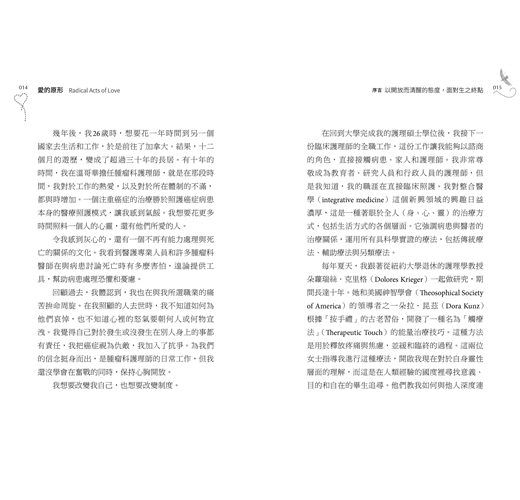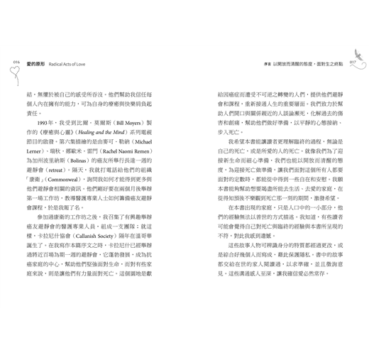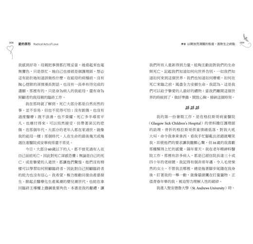 我希望本書能讓讀者更理解臨終的過程,無論是自己的死亡,或是所愛的人的死亡。就像我們為了迎接新生命而細心準備,我們也能以開放而清醒的態度,為迎接死亡做準備,讓我們面對這個所有人都要面對的定數時,都能從中得到一些自在和安慰。我願本書能夠幫助想要竭盡所能去生活、去愛的家庭,在從得知預後不樂觀到死亡那一刻的期間,激發希望。