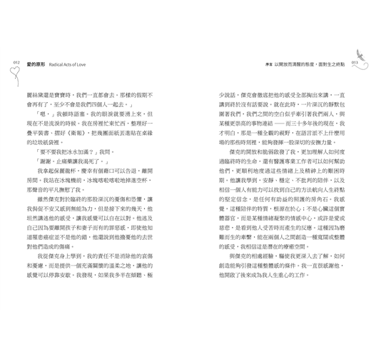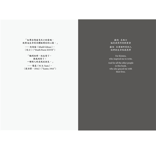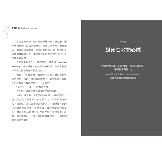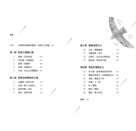 為死亡做準備,是愛的根本功課,為我們自己,也為那些在我們走後活在這個世上、與我們親近的人。我希望,這些故事能為我們人生中最重要、但最少討論的經驗提供一張路線圖,讓身為讀者的你安心。願這些別人餽贈我的教誨故事,能夠療癒、滋養、強化你的心,打開生與死所蘊藏的美──這是你與生俱來的權利。