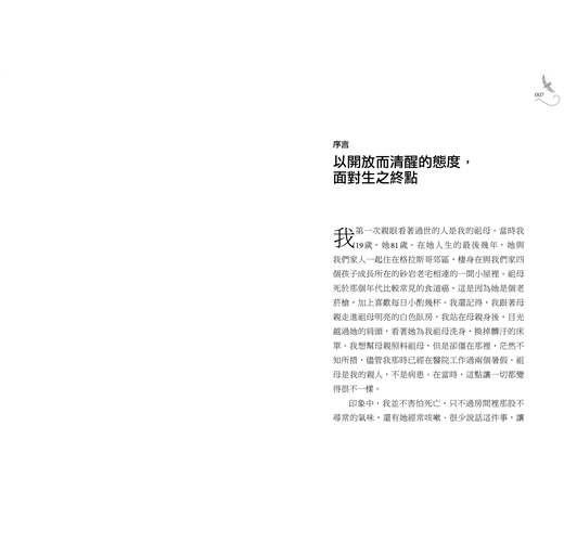 我在那時就了解到,死亡大部分都是自然而然的事。並不容易,但也不見得可怕;沒有創傷,也沒有過度醫療;既不浪漫,也不榮耀。死亡多半尋常平凡,也應付得來,可以坦然接受,但帶著深沉的悲傷。在那個年代,大部分的老年人都在家過世,就像我的祖母一樣;那個時代,人在生命的最後幾天或幾週住進醫院或安寧病房還不常見。