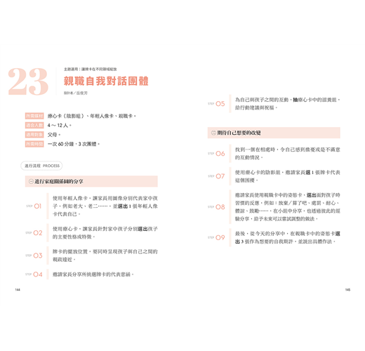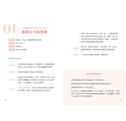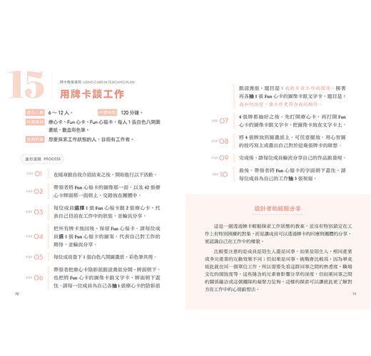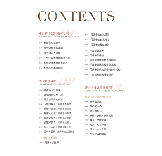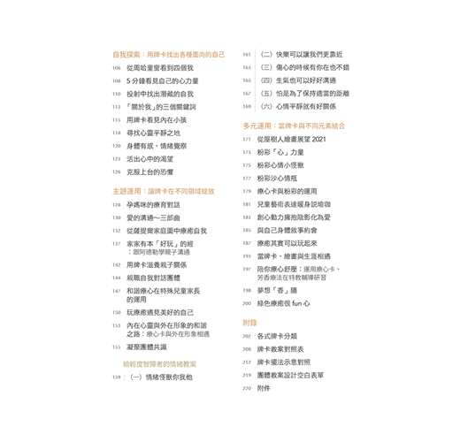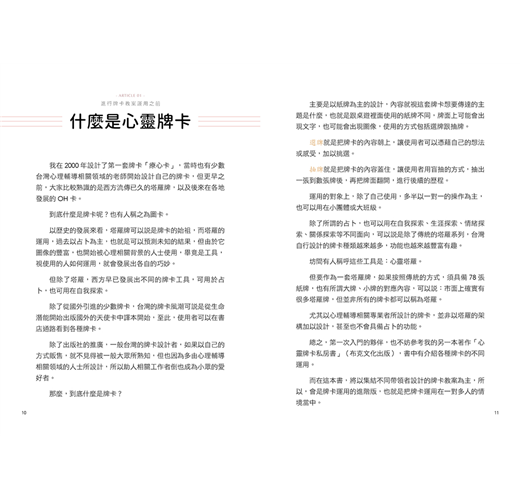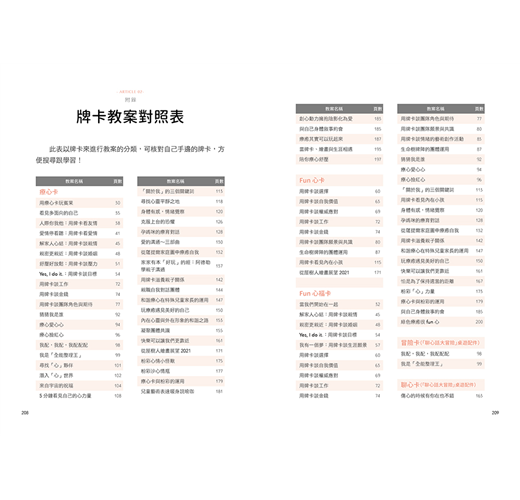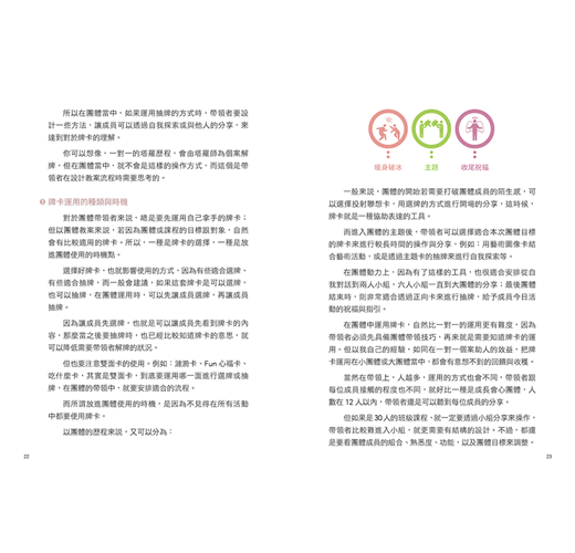 如同這本書的內容,除了有立刻可用的牌卡教案,我也增加了入門的介紹與團體運用的說明。而教案的內容,從暖身到各種主題跟媒材結合的方式,內容多元豐富,可以讓讀者像是拿到使用手冊一般,立刻學習與嘗試!