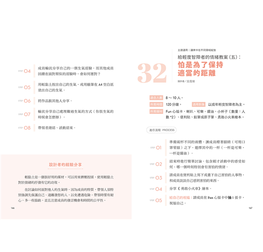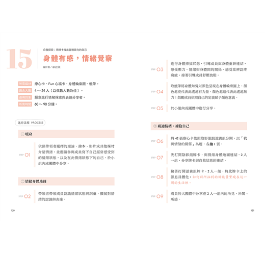 每個玩法都列出操作時間、人數、須備工具材料等,並以Step by step詳細說明,讓帶領者在帶領時能更輕鬆上手。