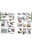 著重在相似鳥類之間的比較,盡可能在同一個版面中放入許多照片,並且使用大量去背圖片。除此之外,照片也包含了雌雄(♀‧♂)、成鳥(Ad)、幼鳥(J)、未成年鳥(imm)、夏羽(S)、冬羽(W)、換羽中的個體、亞種、個體差異等各種不同的形態。括弧內的標示為攝影月份及拍攝者的姓名縮寫(參照p.399)。辨識重點的說明文字也盡量安排在靠近照片的位置,不用移開視線就能確認照片與解說內容。此外,雖然避免重複解說,但是重要的部分還是會在不同的地方以同樣的內容表示。沒有特別標示雌雄的話,就代表雌雄幾乎同色。