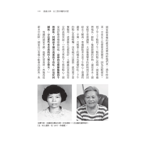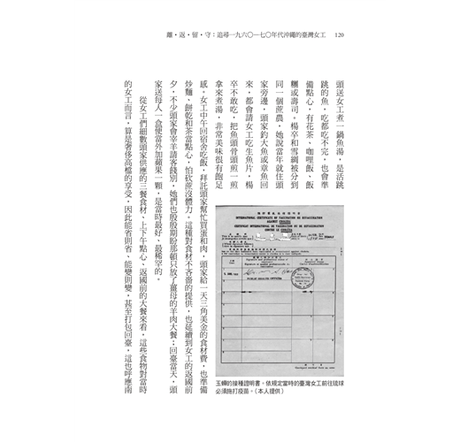 「我總共了去南大東島五次,都是過年前去,快端午節的時候才回來。出國前要先去嘉義打針,當地人也怕我們帶傳染病進去。我們坐大臺遊覽車到基隆港,再坐船到沖繩,出發時我在基隆港等大女兒和女婿,哭得很傷心,人家說因為我哭得太傷心了,才吐得那麼厲害,一上船就有人發塑膠桶和臉盆,看著人家吐,我都不敢吃飯了。入境沖繩時,海關盤問了我快一小時,從出生地、兄弟姊妹、頭家是誰什麼都問,人家教我回答說:十年前來玩過,現在來幫忙砍蔗,會講點日語……我們沒有在船上過夜,直接就上岸了。」