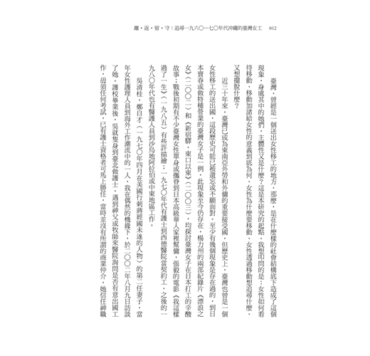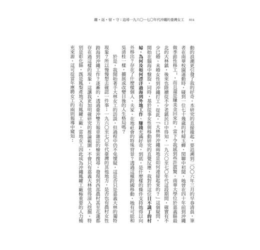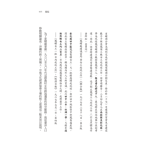 以此為本書的背景舞臺,作者邱琡雯深入大林與南大東島這兩個勞動力送出與接受的現場,以田野調查結合資料爬梳的手法,透過實際去過南大東島工作過的臺灣女工,以及當地雇主與相關人士的敘事,試圖還原兩地人們的面貌與想法;同時也聚焦在嘉義大林,採集相關當事人的口述資料,試圖映射出女工本人、家庭、村落等周遭人們的想法與態度,構築了這段屬於常民、近乎消失的歷史。