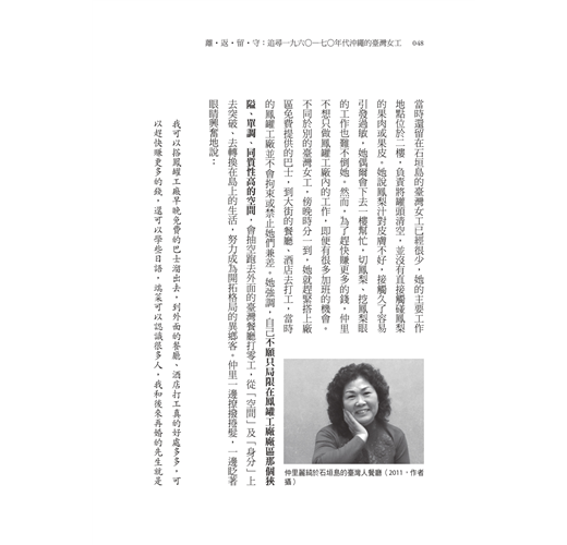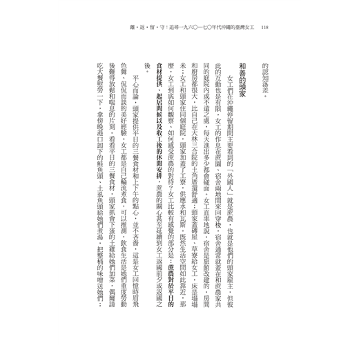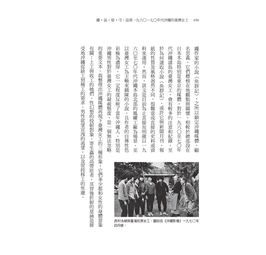 為了凸顯一九六○至七○年代沖繩諸島臺灣女工的多元身影,我不僅從南大東島島民的角度凝視臺灣女工,同時,也要從臺灣女工自身的立場出發,她們到底如何詮釋自己的跨國生命經驗、又如何回望這些島民呢?本章先簡述蔗園或農莊女工的相關論述,再說明女工對於旅地、旅程的看法之所以貧乏的原因,並以和善的頭家和不解的島民兩點來闡明女工對沖繩的回望。