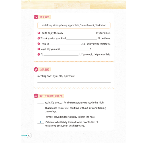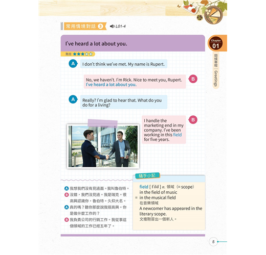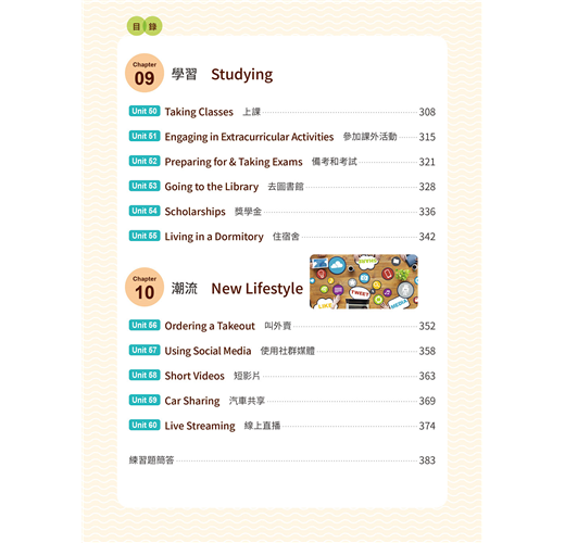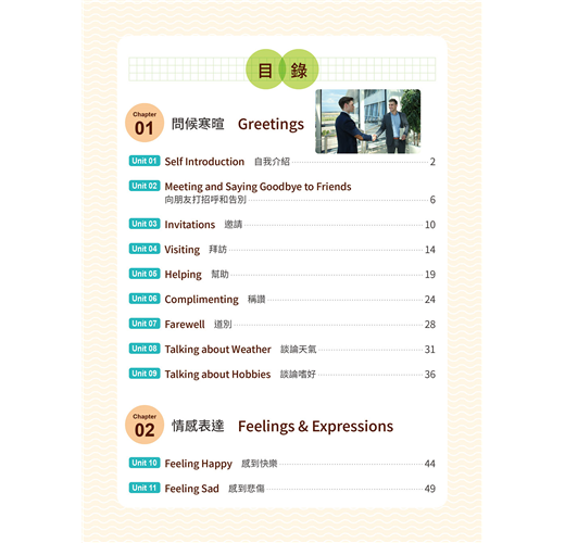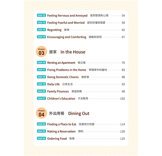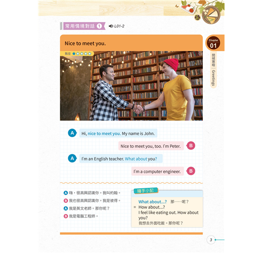 ◆ 10大生活主題:本書涵蓋10大生活實用主題,包括問候寒暄、情感表達、居家、外出用餐、交通運輸等,讓你遇到各種狀況都知道如何應答。