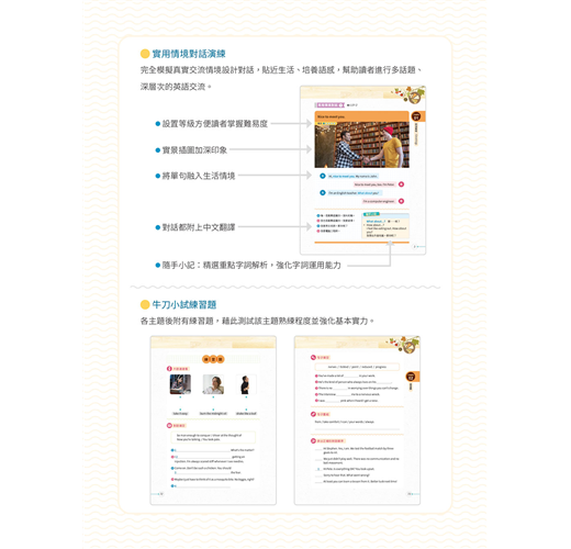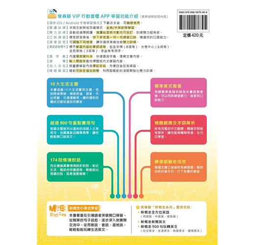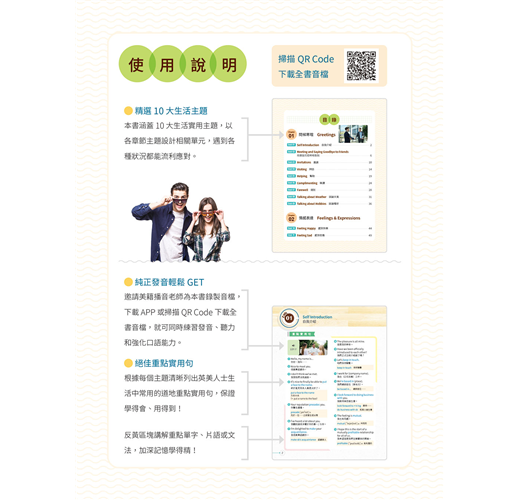 獨家!買1送1!買紙本書送電子書!享受雙功能數位學習:音檔隨掃隨聽+VIP APP行動書櫃,任何時間任何地點都能輕鬆學英文!本書著重新概念引導式學習,引導讀者突破開口障礙,從簡單的句子說起,逐步深入到實際交流中,從而敢說、會說、道地說,輕輕鬆鬆玩轉生活英文。