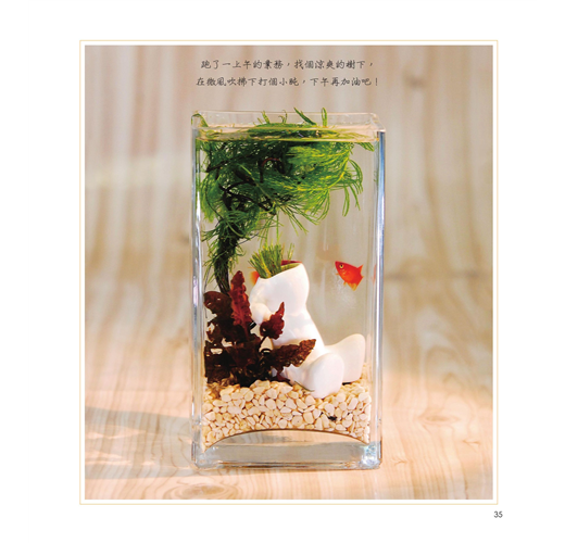 根據上班族的10種心情,創造70盆情境水草小盆栽,如白日夢篇、下班放鬆篇、好想度假篇、鳥事一籮筐篇、就是要裝可愛篇、小資女省錢篇等等,搭配趣味對白,幫你把心聲說出來!