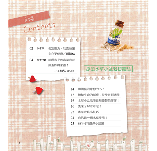 內含園藝治療基礎知識,教你如何成為自己的園藝治療師,遠離憂鬱,保持好心情;還有豐富的水草知識,教你簡單養水草,隨時依心情喜好替換,長保盆栽新意。