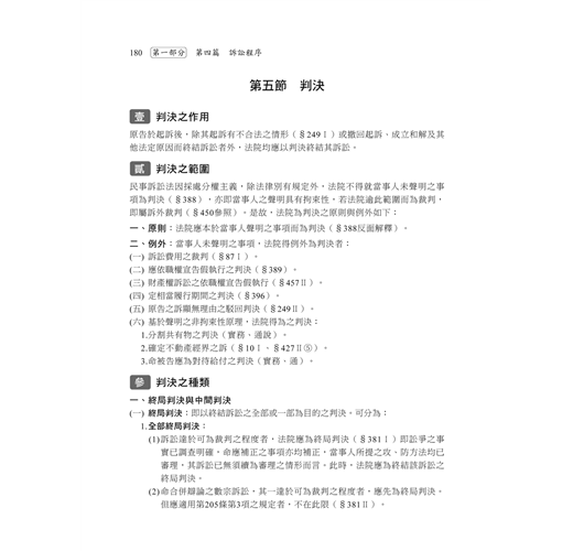 本書的編排方式,首創以集合式的概念將本法區分為六大篇,即1.訴訟主體篇;2.訴訟標的的價額之核定及訴訟費用篇;3.訴訟客體篇;4.訴訟程序篇;5.救濟程序篇;6.特別程序篇,目的也在於幫助有志研習本科的人士能迅速地了解與記憶。