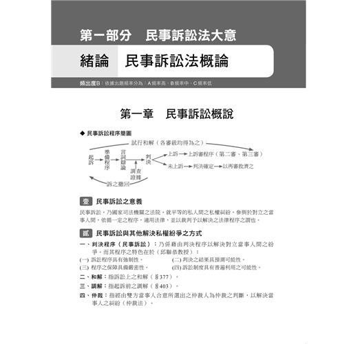 第一部分為民事訴訟法大意、第二部分為刑事訴訟法大意,篇末均含歷屆試題演練,可馬上練習,測試自我的學習程度。
