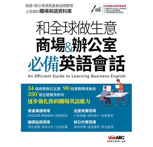 本書分為兩大主題──【商務英語會話】共有會議溝通、產品銷售、議價協商、出差商展以及專業領域等五大類別,提供專業的商業英語學習素材,讓你在洽談商務時能得心應手;【辦公室英語會話】則包含人事行政、協調分工、意見處理以及生活話題等四大類別,提供辦公場合的實用英語,讓你輕鬆拓展職場的人際關係。