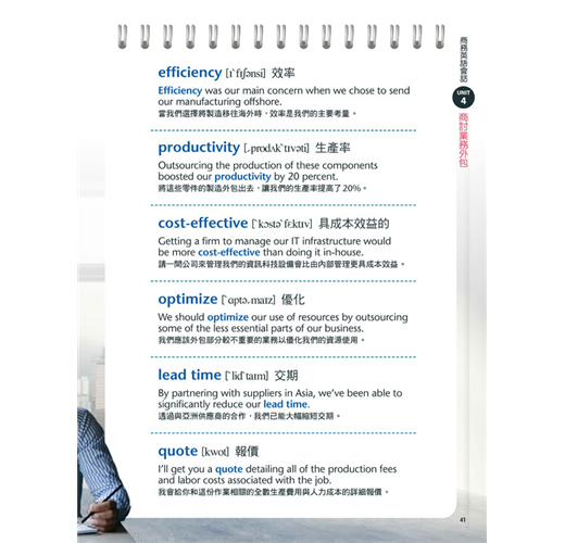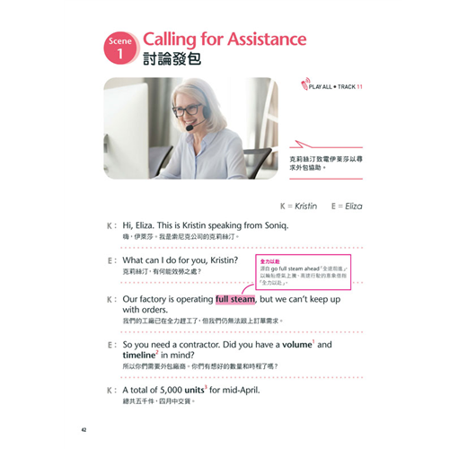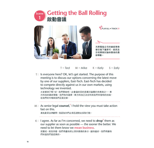 【商務英語會話】和【辦公室英語會話】共收錄 34 個單元,各單元的學習內容分為「必備詞彙與實用句」及「實戰對話」兩大部分──前者讓你迅速掌握相關主題的關鍵用語,備妥基礎的溝通能力;後者共有 90 段專業且道地的英語會話,每段都是豐富且有趣的職場 Live Show,幫你加強口說能力,讓你跟老外主管和同事都能輕鬆對談。