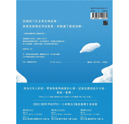 在臺灣生活的2,190個日子裡,就像是有一陣風從背後推著,推動著他持續探索這座島嶼的美景,臺灣總能帶給他出乎意料的驚喜。呼應年少時「我想從老鷹的背上俯瞰全世界」的夢想,《風起臺灣》是他首度以空拍視角拍攝臺灣,全書共收錄北中南東離島60祕境,搭配小林走訪各地的旅行札記與心情,美麗且獨特的照片和文字,讀來格外觸動人心。