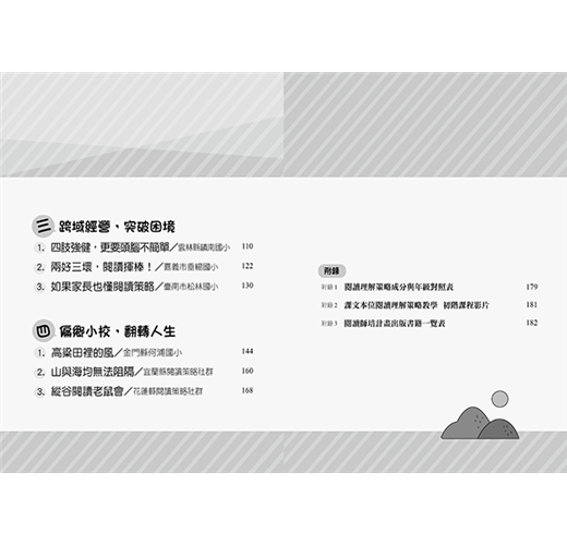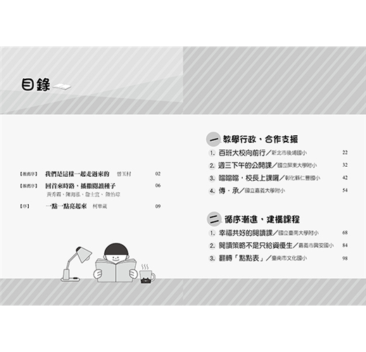 亮點學校規模有大有小,位置有城市有鄉村,特別從中邀請不同推動樣貌的典範,展現各種具體做法,幫助有心推動者找到最適合的閱讀策略推動攻略。