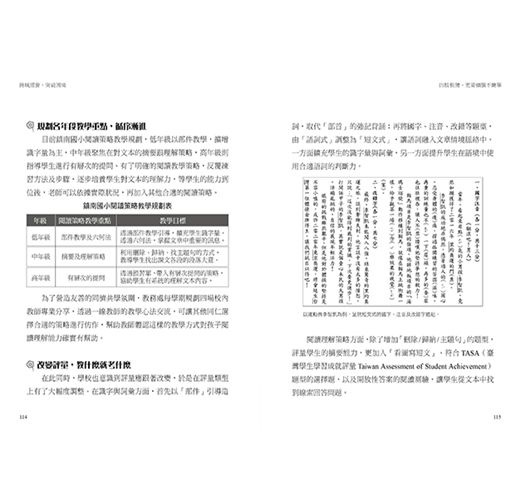 閱讀教育百花齊放,同一種的教學方法在不同的學校有著不同的推動過程與推展的經驗,有的以閱讀理解策略教學為基礎,發展出全校性「幸福共好的閱讀課」;有的找出教師研習的最大公約數,於週三下午時段辦理公開觀議課,藉此讓老師觀而行、起而行;有的翻轉「閱讀理解策略成分與年級對照表」,逐步建構精緻化社群共備;亦有偏鄉小校帶領著家長一起來認識閱讀理解策略,推動閱讀教育。