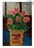 以玻璃為底材,彩繪後再進行窯燒,每當有新作,便拍照與我分享,作品看似率性揮灑,然蘊藏其深厚美學涵養,用色大膽沒有科班匠人的拘泥,件件絢爛奪目,蓋因高溫出窯,可謂熱情如火。更值得一提的是每一幅作品,皆有一首詩來呼應以表達其創作靈感,達到所謂「詩中有畫,畫中有詩」之境,天縱之才,莫不欽羡。