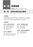 「教育哲學與比較教育」一科是國家考試教育行政類組高考、地方政府特考、原住民特考、身心障礙特考的關鍵科目,具有一定的考試難度,加上教育哲學和比較教育兩個科目包羅萬象,其命題範圍也十分廣泛。因此,本書以最新命題大綱的考試重點,加上目前教育體系最新最重要的資料與議題,採全方位設計編寫,並輔以圖表整理。此外為兼顧教育相關科系者的加深加廣,以及非教育相關科系者,能重頭學起且紮穩實力。作者統計過去題目出處並配合考題趨勢,在每一章節前列出本章「出題頻率」,幫助你了解該章的重要性;並輔以「學習架構」、「名師導讀」、「考點提示」,如此系統化的綱目排列,讓你能有效率的熟悉各章考題類型與方向
