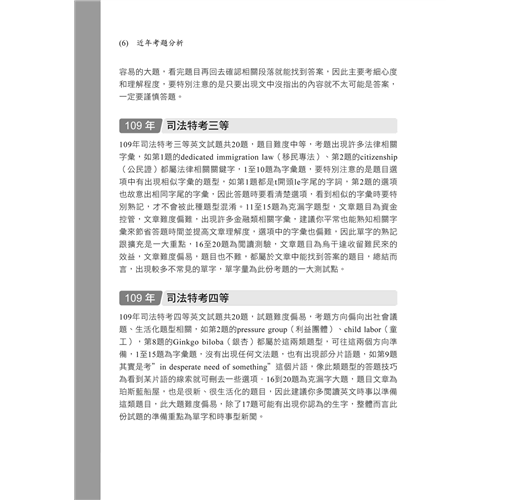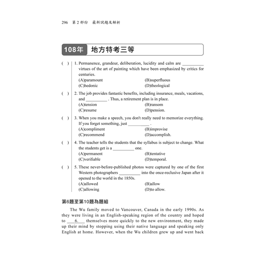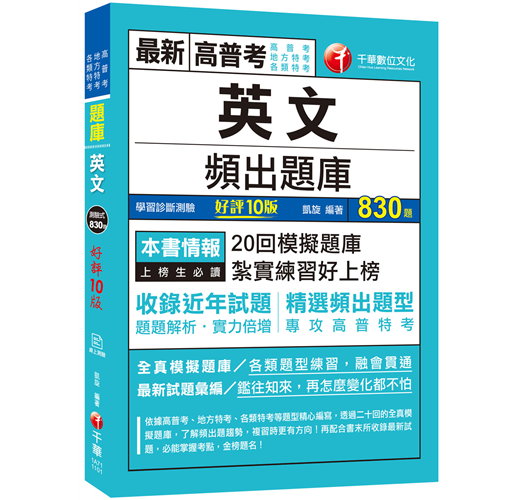 公職考試的英文科試題雖和托福較相似,天南地北無所不考,但從觀察歷屆試題中不難發現,考題中尤其是克漏字和閱讀測驗的出處多為英語的報章雜誌或學術期刊等,並非憑空造題。這意味著公職英文考試範圍雖然廣泛,但依稀仍有出題脈絡可循,像是這些報章雜誌等來源有一個共通點,便是會把焦點聚集在國際間重大新聞或議題,而本書編寫也是依循此一範圍,讓你能夠有一本專攻高普考、地方特考及各類特考的專門題庫,省去你苦苦尋找適用練習題庫的時間!