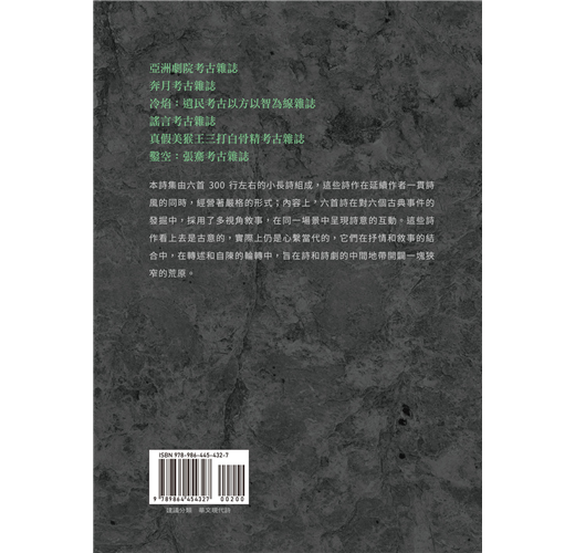 本詩集由六首300行左右的小長詩組成,這些詩作在延續作者一貫詩風的同時,經營著嚴格的形式;內容上,六首詩在對六個古典事件的發掘中,採用了多視角敘事,在同一場景中呈現詩意的互動。這些詩作看上去是古意的,實際上仍是心繫當代的,它們在抒情和敘事的結合中,在轉述和自陳的輪轉中,旨在詩和詩劇的中間地帶開闢一塊狹窄的荒原。