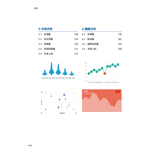 第6章 趨勢分析:常見的趨勢分析類資訊圖的繪製方法與技巧,包括折線圖、區域圖、趨勢泡泡圖。