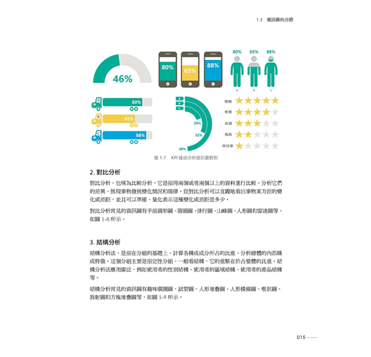第2章 KPI達成分析:常見的KPI 達成分析類資訊圖的繪製方法與技巧,包括手機圖、人形圖、滑珠圖、卡車圖、電池圖、五星評分圖、儀錶板、跑道圖、飛機圖。