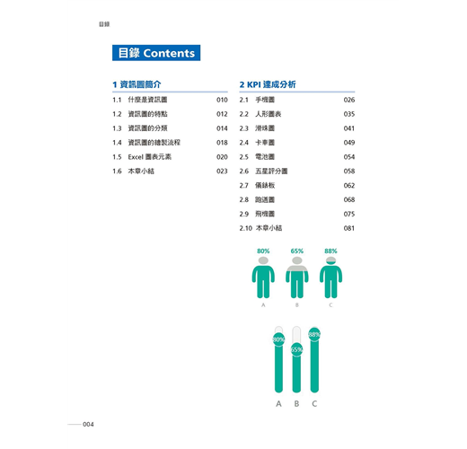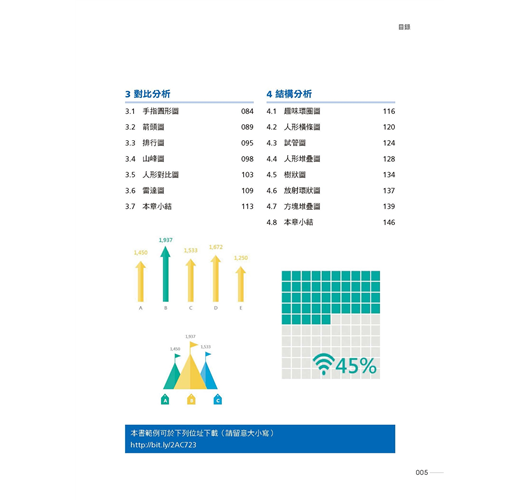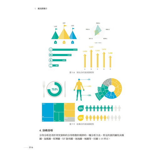 第1章 資訊圖簡介:什麼是資訊圖、資訊圖的特點、資訊圖的分類、資訊圖繪製流程,以及Excel 圖表主要組成元素,為後續學習資訊圖繪製打下基礎。