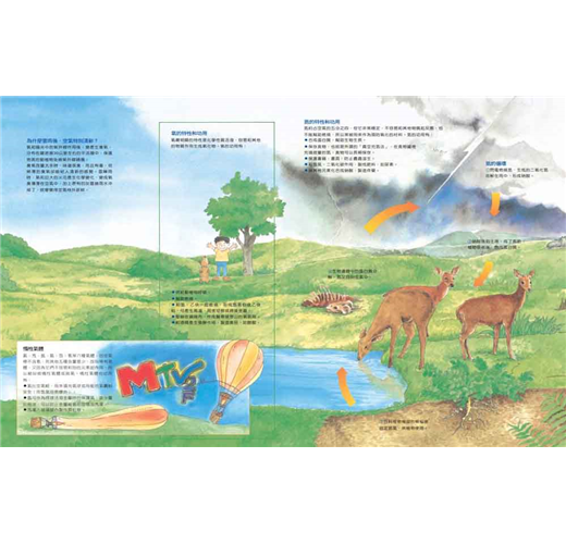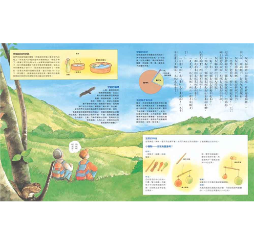 ■特別要強調的是,這套書完全是用圖像來表現的。因為我們相信:知識性、科學性的讀物,用圖畫更能引起孩子閱讀的興趣,也更能達到理解的目的。所以,每一單元都設計有「漫畫」和「跨頁解說圖」兩部分。「漫畫」部分是將該單元概念轉換成二~四頁的趣味情節,讓孩子在看漫畫中不知不覺得到知識;若能因而激發他深入探究的興趣,則可繼續翻開「跨頁解說圖」,藉由精密寫實的彩圖或實驗,循序漸進的引導文字,解答心中的疑惑,獲得更完整、更清晰的科學知識。