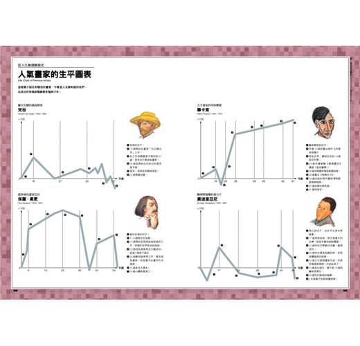 本書選錄200多位的藝術家,介紹其代表作及生平簡歷,更精選8位人氣西洋畫家,根據他們各時期的藝術發展,繪製生平事業表,看圖即懂藝術家生涯的巔峰與低谷。