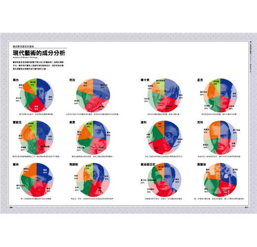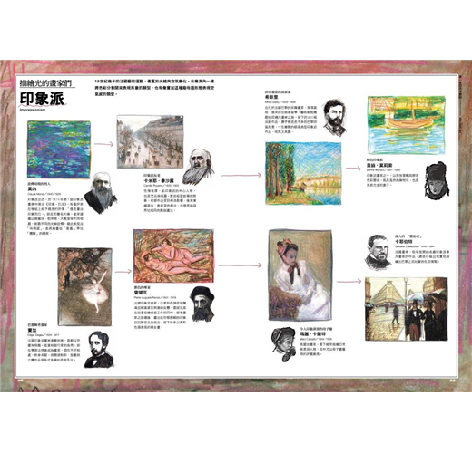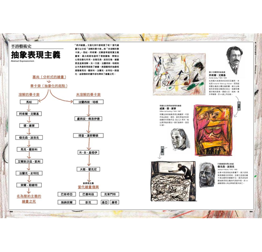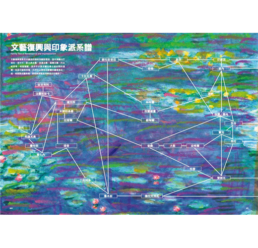 北方文藝復興、後印象派、表現主義,似懂非懂的藝術名詞全都獨立解說,搭配年表、樹狀圖與連結圖,一眼讀懂藝術風格的系譜。