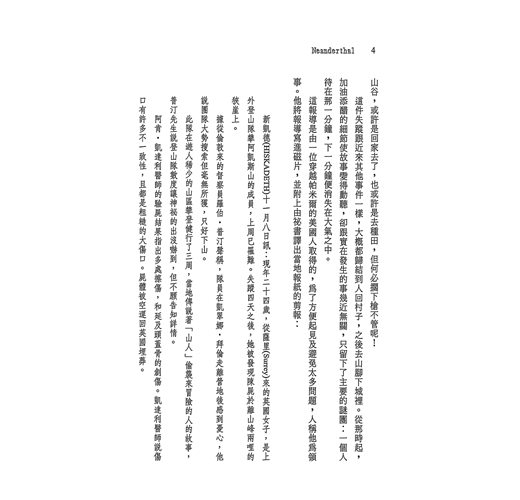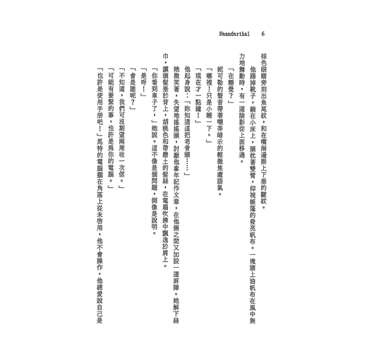 尼安德塔人對人類的仇恨根深,他們不能善待任何入侵的人類;於是他們聚守在深山家園,一面對上山的入侵者進行擄盜殘殺的行動。深究原因,造成尼安德塔人殺人噬腦的是人類自己。尼安德塔人沒有語言,他們藉由第六感溝通,那是一種自然真實的傳遞。人類的語言已發展至最完備的境界,然而這樣的系統卻提供了更多的矯飾與掩藏。第六感的能力是我們從來就沒有,或是未被開發而漸漸消失?如果人類曾經有過,我們本身已被虛妄矯情過分污染,想要重拾那種純真自然的能力也許很難。在這人類為萬物之靈的世界裡,他們即將永遠改變文明的面貌。