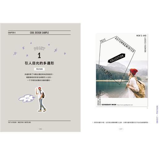 本書收錄許多以「時尚雜誌」、「商店」、「服裝品牌」等相關雜誌、海報、廣告、店卡、裝訂設計作品。以六大章節介紹,包含色彩應用、照片編輯、插圖編排、字型使用、質感紋路、物件應用等詳細解說,是一本以美感設計為目標,不是那種要你豪無理由使用的花俏設計排版,而是精準從各個細節的設計元素切入,提高整體設計辨識度與可讀性,清楚說明產品的目的及特點所在,讓你迅速掌握設計時的要領與知識,成功創造好品味的美感設計。同時也是一本讓你用好用滿的版面設計寶典,當你缺乏設計點子時,翻一翻,找一找,不但幫助你思考,還可從有趣的案例中找到可以再活用的設計要點。