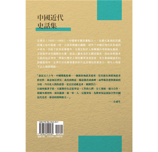 左舜生(1893-1969),中國青年黨的黨魁之一,在變化莫測的民國政壇上叱吒風雲一時。又因長期擔任編輯,研究了中國近現代史長達十四多年,出版了許多史學著作。左舜生對於人物事蹟的考辨極為重視,又因每件涉及國際的大事,敘述上難免流於主觀或偏見,因此他根據多元面向加以考究,將每位歷史人物刻畫得清清楚楚。各文章娓娓道來的舒緩風格中,左舜生往往會借重詩詞作品來增加其感染力,強化人物當下之心情與情緒。