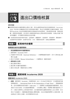國貿業務乙級技術士證照考試除了學科外,還有術科,其單元分為基礎貿易英文、貿易流程圖、商業信用狀分析、單據製作與出口價格核算等題型。書中依據最新Incoterms 2020貿易條規編寫。針對各章節內容加以解說,並依據勞動部範例題予以分析說明,最後再配合歷屆試題解析,讓你在理解各章內容及考題的同時,也能增強解題技巧。其中因勞動部所公布的測驗試題範例與一般國際貿易書籍的計算方式大不相同,但卻有脈絡與公式可循,故本書中詳細列出範例中的各個公式,並仔細列出了每一個步驟的計算過程,只要你跟著書中解說的內容再搭配公式運用,那麼對於各種出口價格核算的問題皆可得心應手,手到擒來。