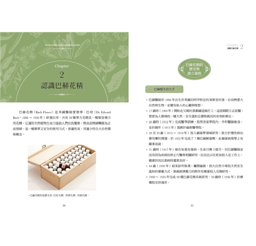 ※專業推薦 花精療法是屬於自然療法的一環。其始祖是英國的愛德華‧巴赫醫生,在1930年代製作出花精,用來改善人們的負面情緒。而這種情緒自癒療法在許多國家已有幾十年的歷史,算是一般家庭的常備療方,可以日常飲用,也可以用來塗抹,不但溫和不刺激、人人適用,而且安全有效。