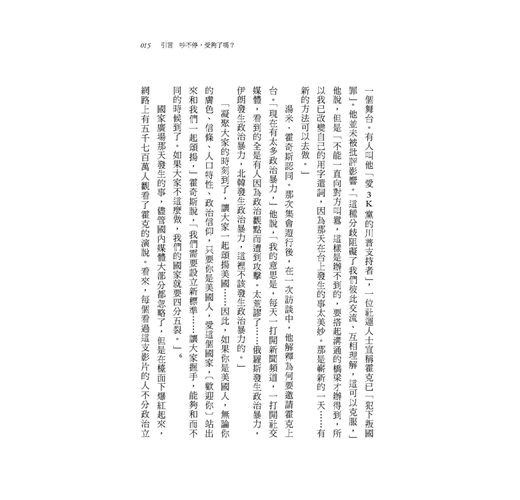 你可能以為,這又是一本呼籲我們政治論述要更有公德心,要包容差異觀點的書,但它並不是,那些標準都太低了。不信嗎?要是跟大家說:「我與配偶彼此以公德心相待。」人家會建議你們去做婚姻諮商;或者說:「我同事都很容忍我。」人家會問你新工作找得怎麼樣了。