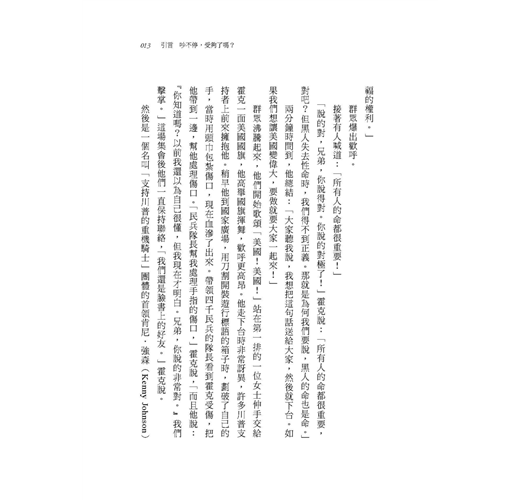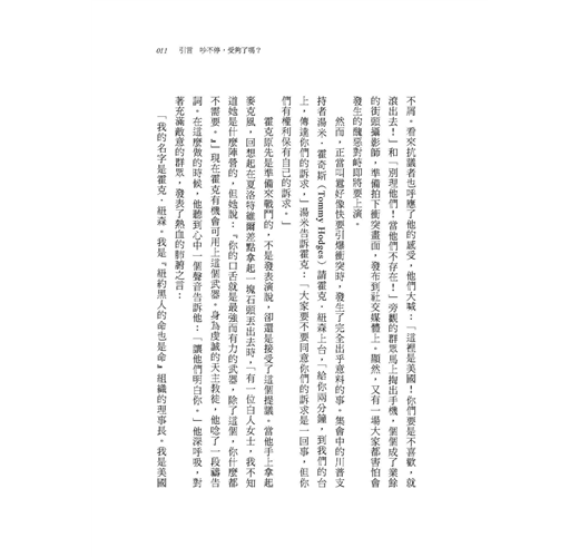 「說的對,兄弟,你說得對。你說的對極了!」霍克說:「所有人的命都很重要,對吧?但黑人失去性命時,我們得不到正義。那就是為何我們要說,黑人的命也是命。」