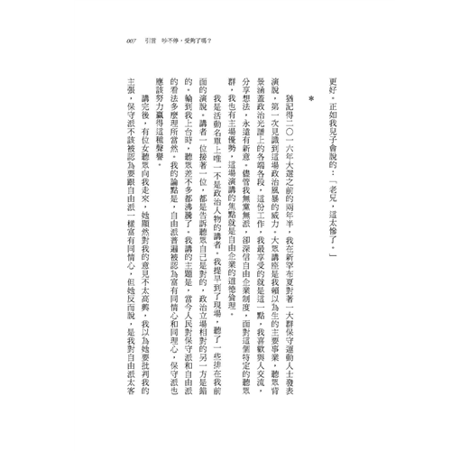如果你對國內有毒的思想氛圍感到滿意,你不需要讀這本書。但是如果你想對抗現行荒唐的世道,作者告訴我們如何充滿喜悅與信心地做到這一點,而且不論你的政治傾向屬於哪一方。——內布拉斯加州美國參議院議員 班.薩斯Ben Sasse