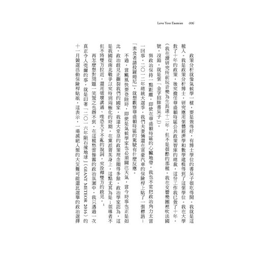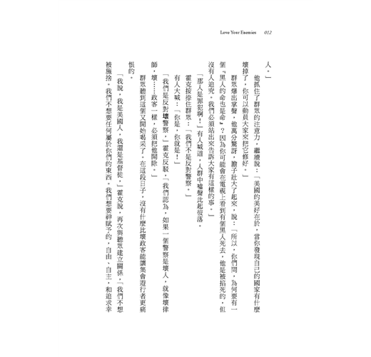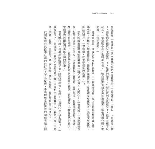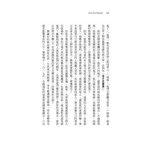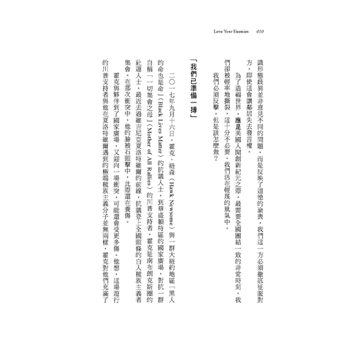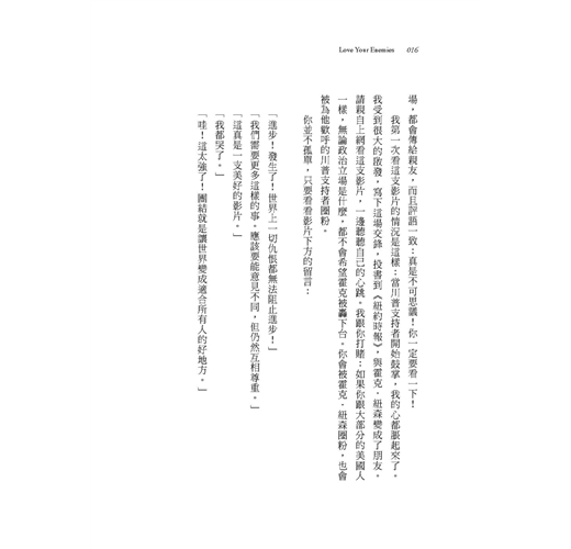 愛不是軟弱,也不是傻氣。但要愛誰?愛自己的朋友,這簡單。愛陌生人?也可行。但愛你的敵人呢?對你而言這或許不可能。你可能會說:「有的人就是出格。這個國家有上百萬糟糕的人,提出難以包容的見解,他們應得的待遇就是輕蔑,不是愛!」我曾聽過認真的記者、受人尊敬的學者和主流政客,說出這種情緒化的話。
