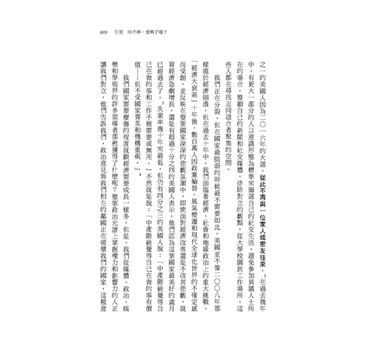 無論你的政治傾向是右派、左派或中間路線,多半都遇過這種事,而且這種事可能正影響著你的人生。舉個例子,二〇一七年一月路透社的益普索民調結果顯示,六分之一的美國人因為二〇一六年的大選,從此不再與一位家人或密友往來。在過去幾年中,有更大一部分的人以意識形態為標準來篩選自己的社交生活,避免參加異議人士所在的場合,整頓自己的新聞和社交媒體,排除對立的觀點,從大學校園到工作場所,這些人都在尋找志同道合者聚集的空間。