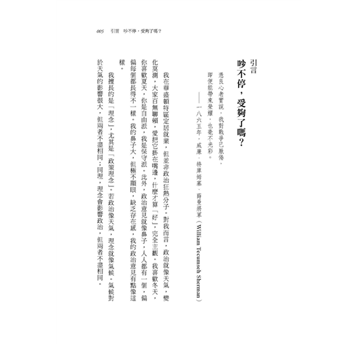 我擅長的是「理念」,尤其是「政策理念」。若政治像天氣,理念就像氣候。氣候對於天氣的影響很大,但兩者不盡相同;同理,理念會影響政治,但兩者不盡相同。