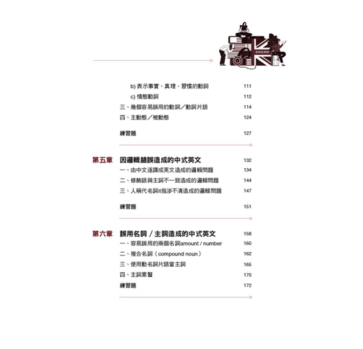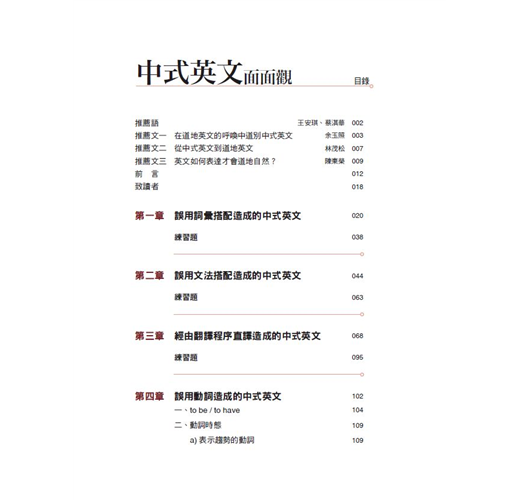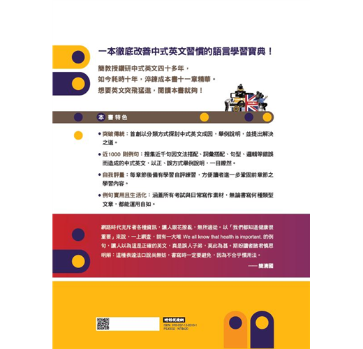 作者潛心研究中式英文四十多年,發現在學生習作錯誤中,除了冠詞和副詞之外,幾乎都有中式英文的影子。本書首創以分類方式探討中式英文的成因,舉例說明,並提出解決之道。