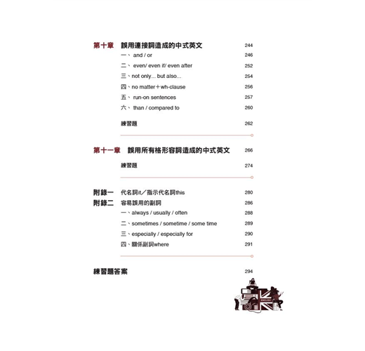 全書分成十一章,另加兩篇附錄,完全取材自學生的實際寫作錯誤範例,以正、誤句子呈現,並附以解釋說明。原稿都經加拿大籍英文老師修正,具有相當的準確性。兩位老師文字修養極好,且都擁有英文碩士學位,任教英文數十年。衷心希望本書不僅成為愛好英文人士的參考書,也廣為各級學校採用的翻譯、作文教科書。
