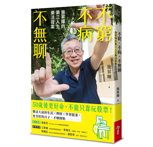 施昇輝的這本新書就是寫退休生活,也就是所謂的「第三人生」。他標舉退休生活的目標叫作「不窮、不病、不無聊」,這句話我讀了非常佩服,平凡幾個字卻說到了很有內容的境界,也同時指出了幾個重要功課。你要「不窮」,得有一點理財的準備;要「不病」,得有健身的習慣;要「不無聊」,得有些生活安排。當中書裡頭說得更多,舉了各式各樣有趣的例子,讓你感覺無限嚮往,原來退休並不是人生賽事的終結(你以為要進入「垃圾時間」了嗎?),而是另一個無限寬廣、多彩多姿的主戲正要開場……