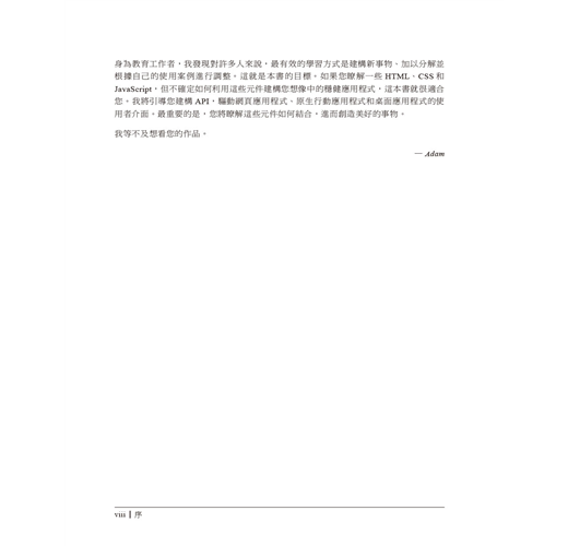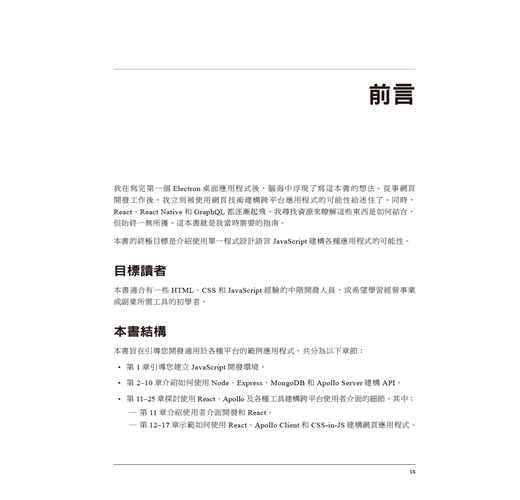 作者Adam D. Scott是一名工程主管,精通Node.js、GraphQL、React、React Native及Electron等技術。本書適合想要建構全堆疊應用程式的開發人員,以及有志成立新創公司的網頁開發初學者,內容主要說明如何創造適用於多個平台的單一CRUD型態應用程式。