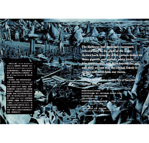 ☆田邊剛將洛夫克拉夫特的贅長文字去蕪存青,對原本已經具畫面感的《瘋狂山脈》進行充滿魄力的視覺改編,變得更易入口,