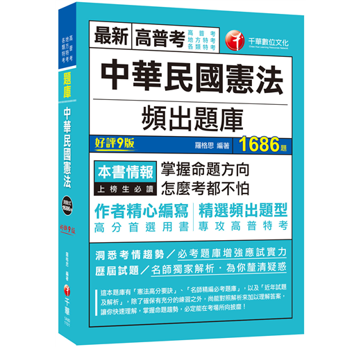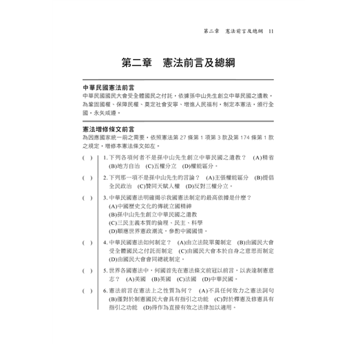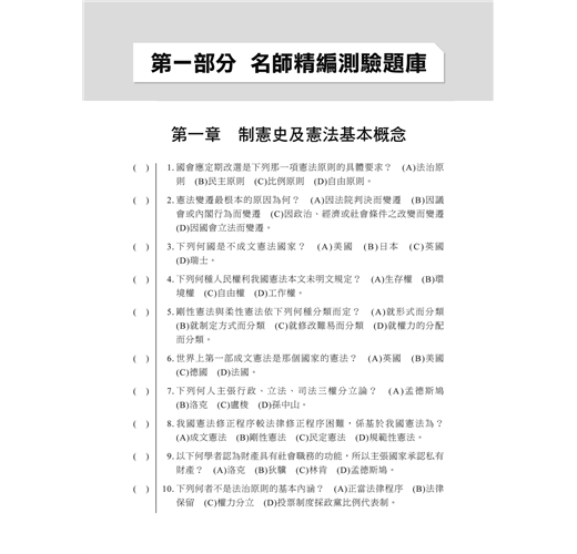 千華名師團隊精心蒐羅金榜題庫,藉由題庫演練確認自己功力深淺與尚嫌不足的地方,並可針對弱點加強補救,是考前必備第一要務。本書將必考重點精華濃縮整理,透過題庫釐清憲法概念,並能將重要法條反覆記憶,打通思路的奇經八脈,極為適合考前強化記憶、零碎時間隨時進補專用!